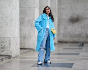 Sky Blue Long Coat with Distressed Jeans Evening Look