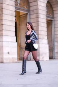 This navy and white striped blazer is like the perfect mix of business and fun all rolled into one. The black mini dress underneath keeps things simple while the blazer adds that smart, pulled-together vibe. Those knee-high black boots are absolutely everything – they make you feel like you could conquer the world.