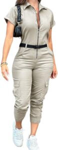 Check out this cool beige jumpsuit! It’s perfect for petite curvy gals who want a mix of style and comfort. The short sleeves roll up easy for warm days. A front zipper lets you adjust how much to show off. That black belt cinches the waist, hugging your curves just right.